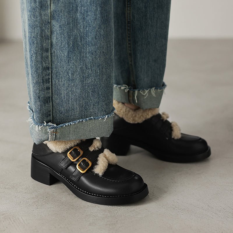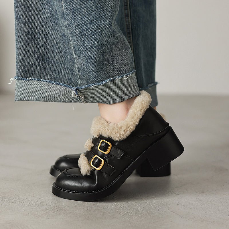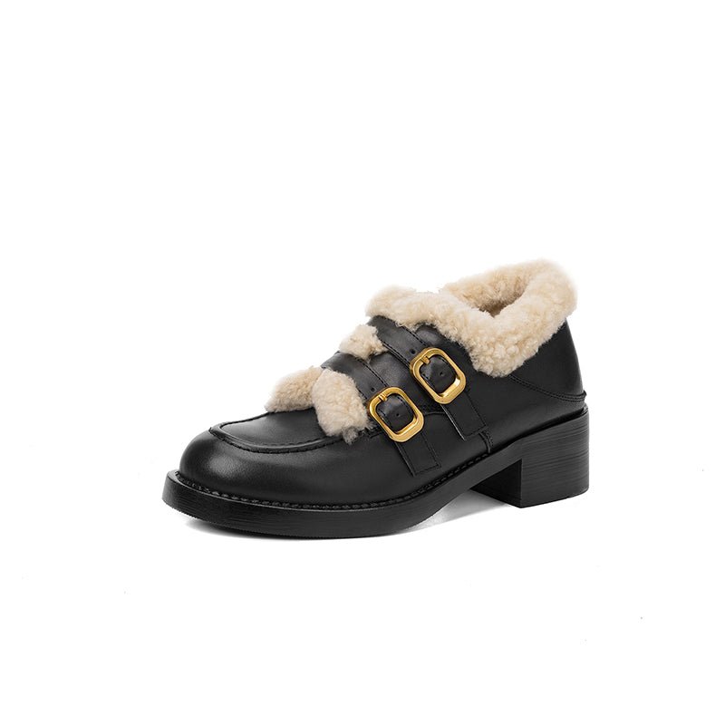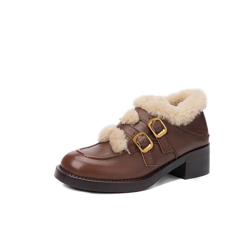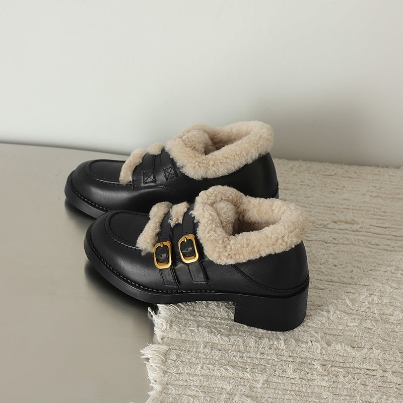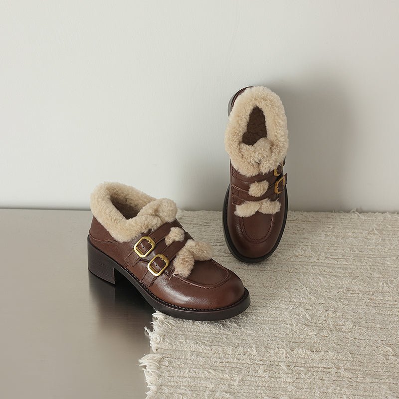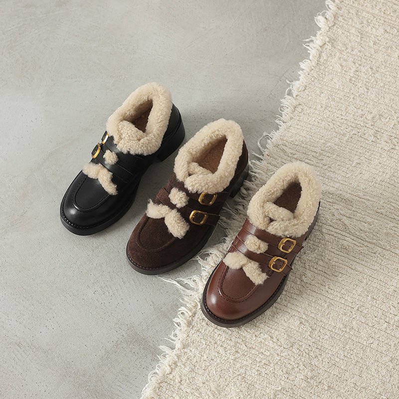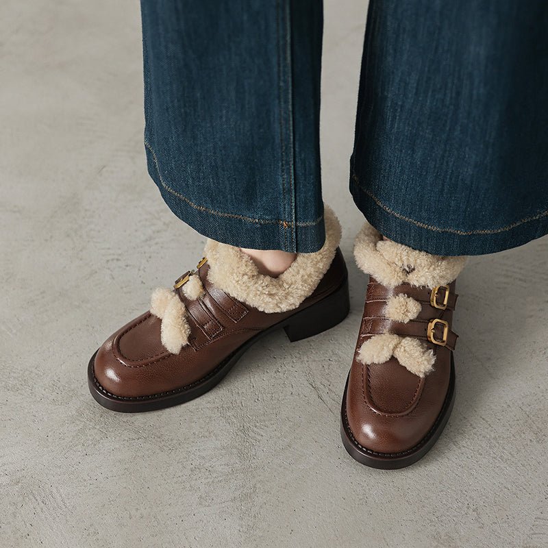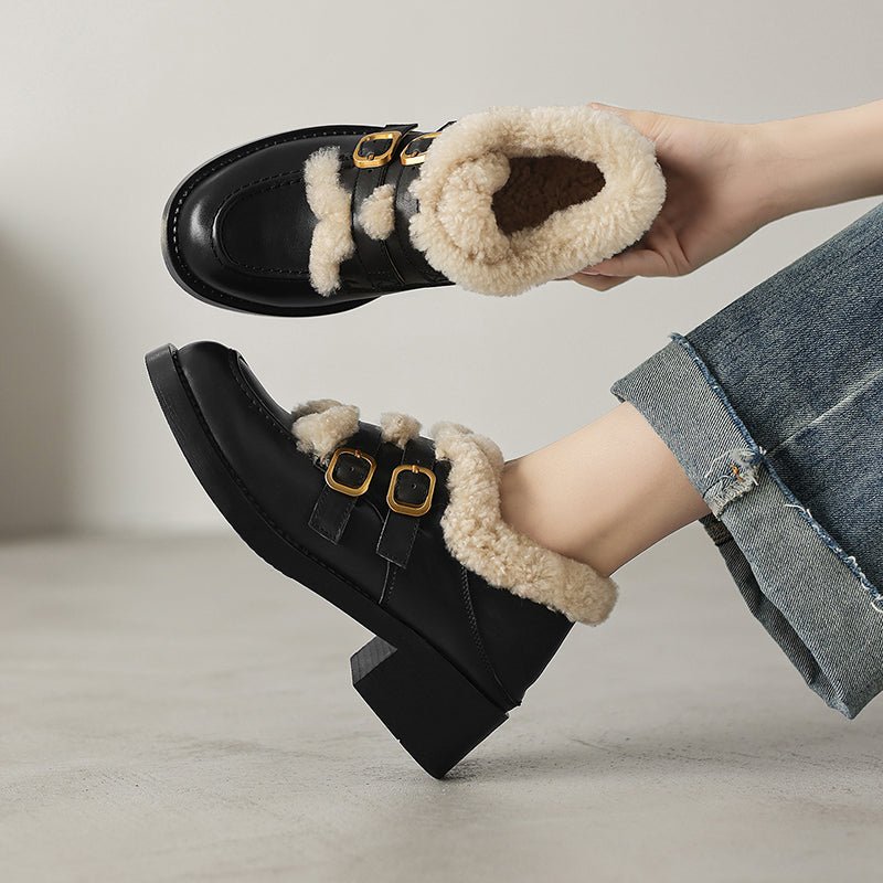 These women’s winter loafers feature a classic round toe design paired with double metal buckle straps for a vintage-inspired yet fashionable look. Crafted from premium top-layer cow leather or soft suede leather, the upper is accented with a shaggy texture that adds warmth and visual depth. The interior is fully lined with long plush for superior insulation and cozy comfort during cold weather. Perfect for casual outfits, skirts, or retro styling, these shoes blend elegance, warmth, and practicality for the winter season.